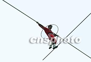 “高空王子”阿迪力唯一传人沙特尔五月一日起在广州香江野生动物世界挑战吉尼斯世界纪录。这位十五岁的维吾尔族少年将在虎山上空度过二百小时,挑战生存极限。图为小伙子在钢丝上表演呼啦圈。作者:梁永强