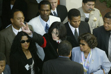 面对大批前来声援与支持的歌迷,杰克逊仅向群众挥挥手便快步进入法院。与上次出庭不同的是,杰克逊今天神轻相当轻松自在,不时露出微笑。虽然仍然有助理在旁亦步亦趋为他撑着黑伞,但杰克逊当天并没戴着“招牌形象”的墨镜,而是一般眼镜。