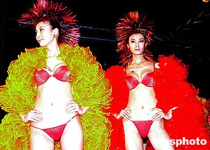 五月,著名的黛安芬内衣公司将全面上市2004“危险曲线”内衣新品。图中模特展示的是新品内衣“奢华曲线”情景,这款内衣淡淡的桃红色内衬着纯白的刺绣蕾丝,晶扣设计搭配低胸剪裁,奢华中尽展女性的妩媚。中新社记者:王丽南