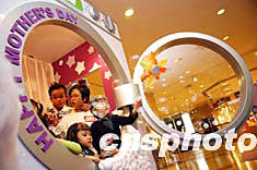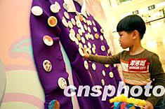 5月6日,香港小朋友在海港城举办“母亲节率先表爱意”活动,将徽章挂在巨型衣服上,庆祝母亲节。作者:洪少葵