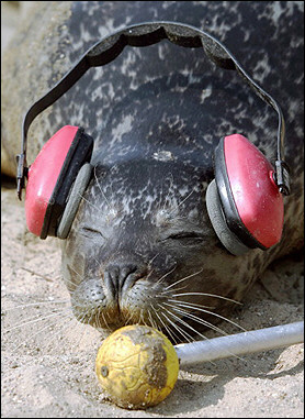一个正在接受科学研究的14岁海豹头戴耳机,样子憨态可掬。