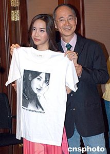 香港唯美派导演杨凡与韩国影星河利秀展示该片宣传T恤。作者:邓庆乐