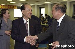 全国人大华侨委员会访日团一行五月十一日在东京与旅日侨界人士座谈,其热点汇集在为众多新老华侨所共同关注的子女华文教育问题。图为率团访日的陈光毅主任向横滨山手中华学校校长潘民生询问相关情况。作者:王健