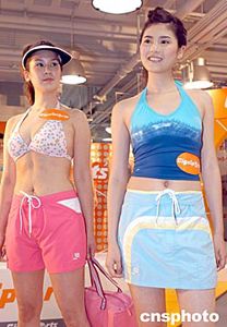 乐坛新星官恩娜(右)、歌星陈见飞5月12日在香港出席全港最大的运动专门店GigaSports SuperStore开幕,两人客串模特展示最新泳装。  Maggie Q获GigaSports颁发「健康有个性完美体态之星」奖项。作者:邓庆乐