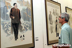 纪念邓小平诞辰一百周年殷培华画展八月二十日在中国美术馆隆重举行,著名军旅画家殷培华描绘小平辉煌而伟大一生的绘画作品吸引观众。这是一位外国观众在认真观赏作品《千年宏图》。中新社记者:张勤