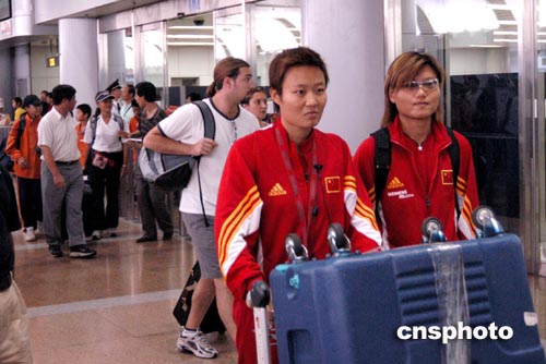 八月二十日下午四时,在雅典奥运会遭受空前挫折的中国女足返抵北京首都机场,女足队员与教练步出机场之际,浓浓的悲怆之情笼罩候机大厅。图为国家体育总局有关领导前往机场迎接。作者:徐曦弋