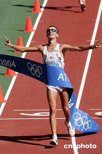 在当地时间8月20日举行的男子20公里竞走比赛中,意大利选手布鲁格内蒂夺金。图为他在冲过终点后欢呼的镜头。