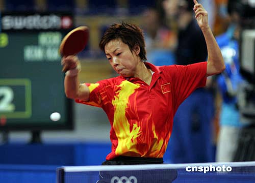 张怡宁面对善于打旋转球的韩国选手金景娥表现得十分冷静,五局的比分是13:11、11:8、11:5、5:11、11:8。