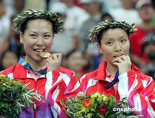 中新网8月21日电 在刚刚结束的雅典奥运会羽毛球女子双打决赛中,中国选手张洁雯/杨维以2:1战胜队员高崚/黄穗,使中国代表团再增一枚金牌和一枚银牌。三局的比分分别为7:15、15:4和15:8。