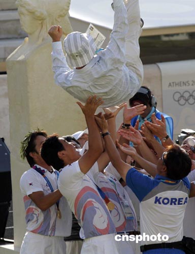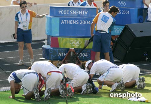 当地时间8月21日下午,在雅典奥运会男子射箭团体决赛中,韩国男子射箭队凭借强劲实力夺得金牌。中新社记者:张炜