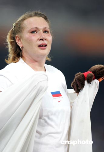 当地时间八月二十一日晚,在雅典奥运女子铁饼比赛中,俄罗斯名将萨多娃第五投掷出了六十七米零二的成绩,不但摘走金牌,也击碎了希腊人科列西多的夺冠梦想。中新社记者:毛建军