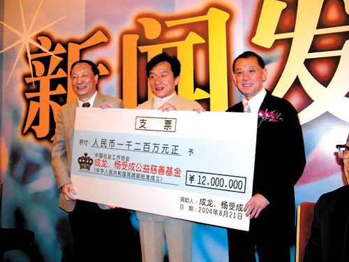 中新网8月22日电 向来乐于施善的香港国际动作巨星成龙、英皇集团主席杨受成,21日联合向中国社会工作协会捐助一千两百万元人民币,设立“成龙杨受成公益慈善基金”,用于支援和帮助内地有关老人、妇女、儿童、贫困人员等需要帮助者,开展多种爱心救助计划,建立和改善内地社会福利和公益设施,吸引更多人关心慈善事业,添砖加瓦,促进公益慈善事业的发展。