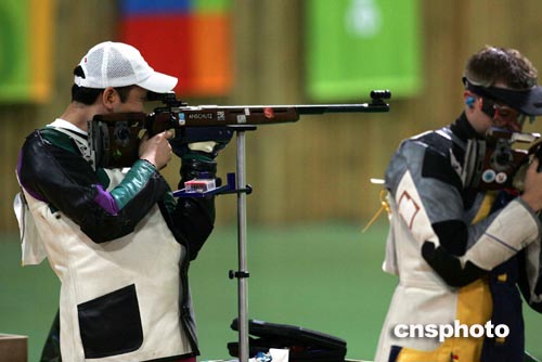 当地时间八月二十二日下午,在雅典奥运会男子三乘四十射击比赛中,中国的贾占波以一千二百六十四点五环的成绩获得金牌。中新社记者:毛建军