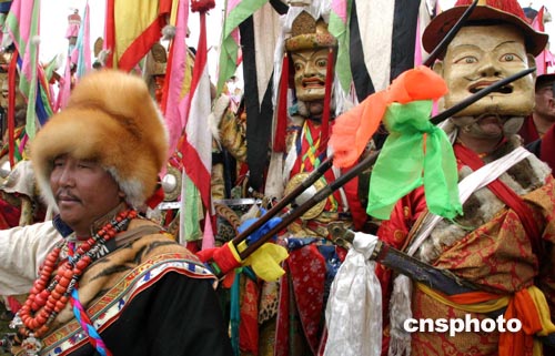 头戴斑斓面具的藏族寺庙仪仗队声势夺人。