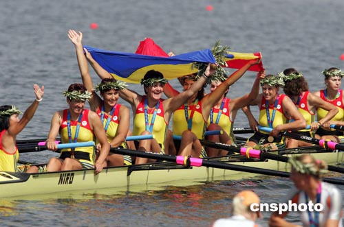 当地时间八月二十二日,罗马尼亚队获得雅典奥运女子八人单桨有舵手赛艇比赛金牌。中新社记者:毛建军