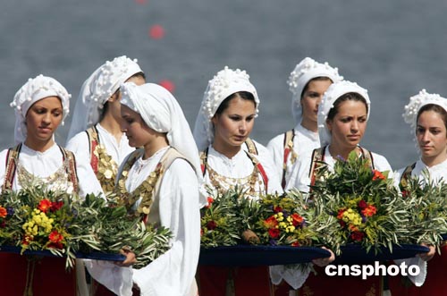 当地时间八月二十二日,身着民族服装的颁奖女郎在雅典奥运赛艇赛场。中新社记者:毛建军