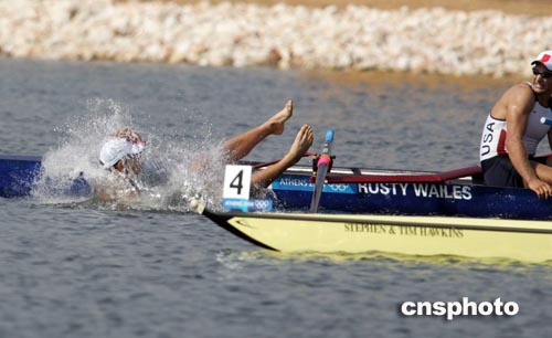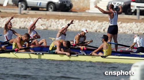 当地时间八月二十二日,美国队在雅典奥运八人单桨有舵手比赛中得胜,队员们到达终点高唱凯歌。中新社记者:毛建军