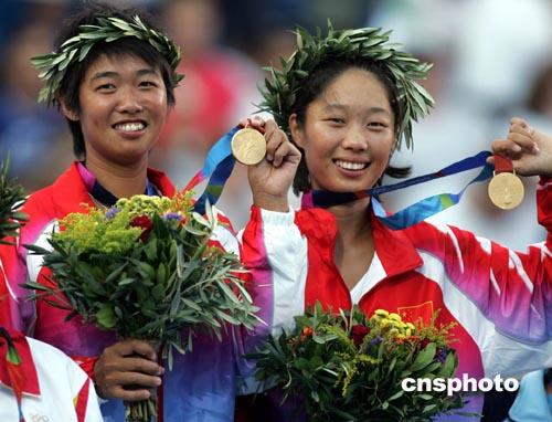 中新社雅典八月二十二日电 当李婷/孙甜甜在刚刚结束的雅典奥运会网球女子双打决赛中为中国再添一金,中国在本届奥运超过美国,重登金牌榜首位。