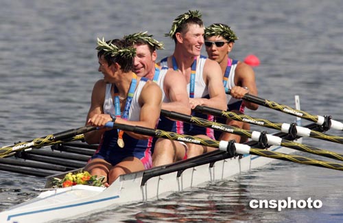 当地时间八月二十二日,俄罗斯队在雅典奥运四人双桨赛艇比赛中获得冠军。中新社记者:毛建军