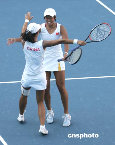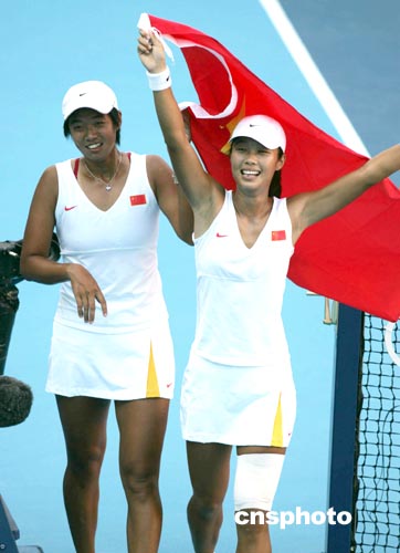 雅典时间8月22日傍晚,中国网球选手孙甜甜、李婷(左)在奥运会女子双打决赛中以二比零战胜西班牙选手,令人震惊地获得冠军。中新社记者:任晨鸣