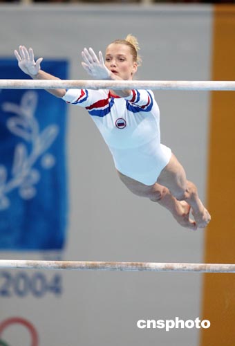 当地时间八月二十二日晚,在雅典奥运女子体操单项决赛中,俄罗斯“冷蝴蝶”霍尔金娜在高低杠上失误落下,失去夺金机会。中新社记者:毛建军