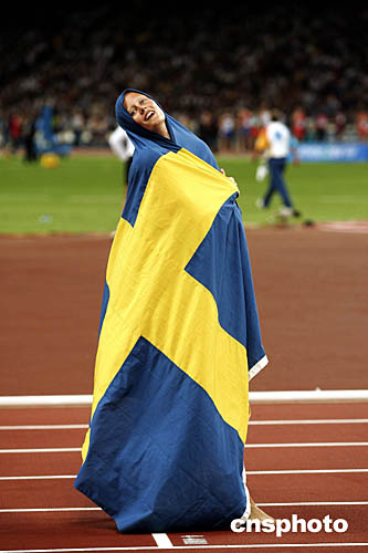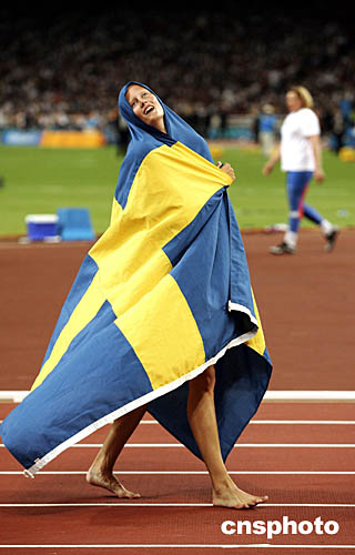 图为瑞典选手克鲁夫特(Kluft Carolina)在获得女子七项全能冠军后,身披国旗以示庆祝的画面。