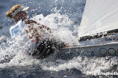 图为当地时间8月20日举行的帆船帆板女子欧洲级比赛中,挪威运动员Siren的表现。