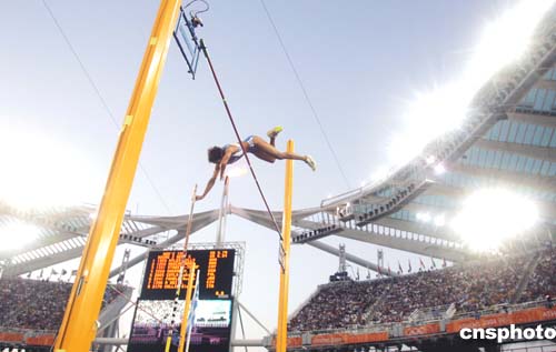 图为当地时间21日举行的女子撑竿跳资格赛比赛现场。