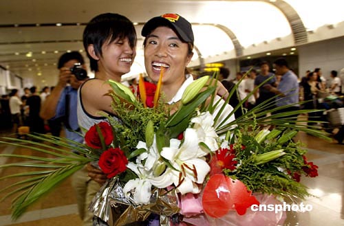8月23日,在雅典奥运会自行车女子500米计时赛中夺得银牌的中国老将江永华(右)回到北京,在首都国际机场受到热烈欢迎。中新社记者:盛佳鹏