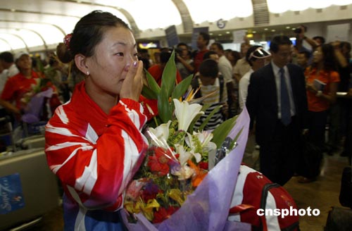 8月23日,参加雅典奥运会的中国射箭队主力队员何影回到北京,在首都国际机场受到人们的热烈欢迎。中新社记者:盛佳鹏