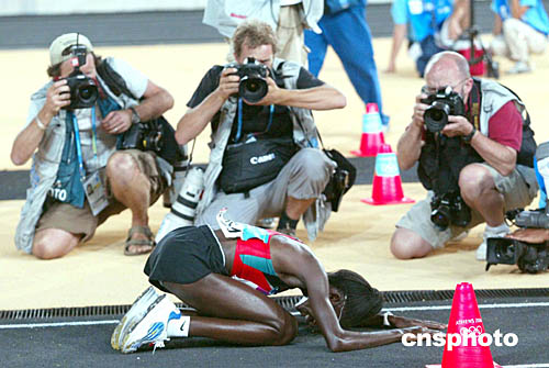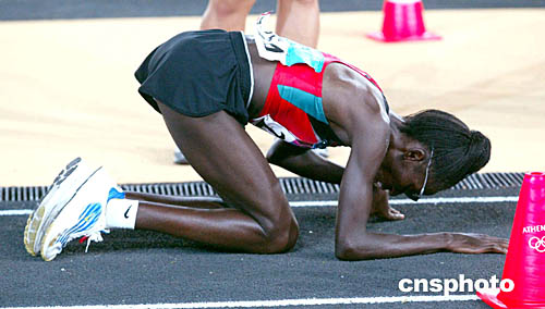 图为肯尼亚选手恩德雷巴(Catherine Ndereba)在夺得女子马拉松赛银牌后跪倒在地呈膜拜的镜头。