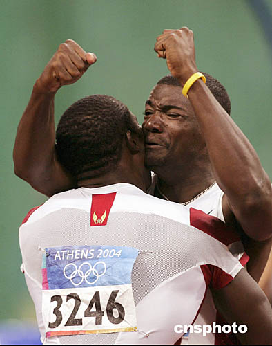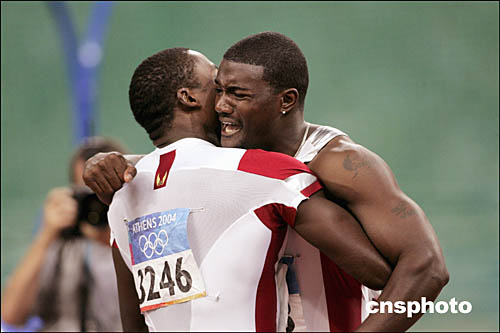 图为美国选手加特林(Justin Gatlin)在勇夺男子百米冠军后紧紧拥抱师出同门的肖恩·克劳福德(Shawn Crawford)