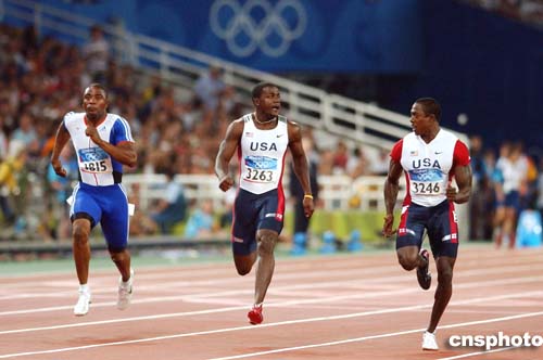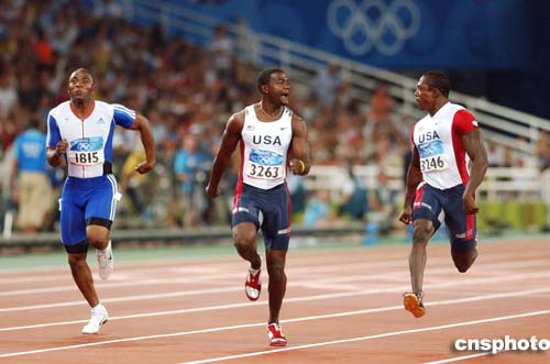 在当地时间22日进行的男子100米半决赛中,美国选手Justin Gatlin和Shawn Crawford一边比赛,一边交谈。