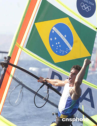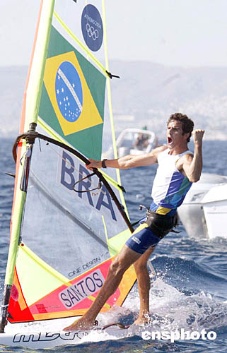 图为巴西选手SANTOS Ricardo在当地时间8月23日举行的帆船帆板比赛中的表现。