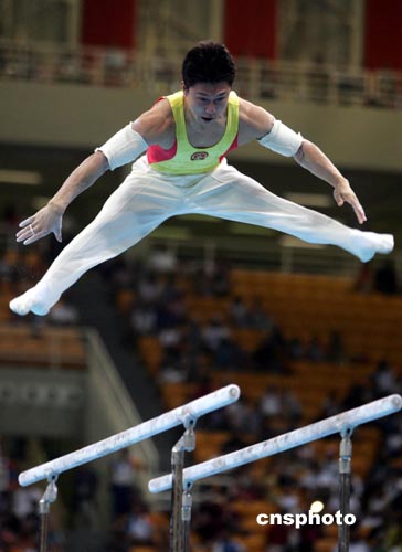 雅典奥运会体操比赛当地时间八月二十三日结束,近几年被炒做为“世界男子体操梦之队”的中国男队令人极度失望。领军人物李小鹏在单项比赛中失误连连,获得一块双杠铜牌,与金牌无缘。中新社记者:任晨鸣