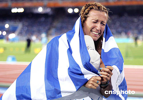 图为希腊选手Hrysopiyi DEVETZI在获得女子三级跳远亚军后庆祝的场面。