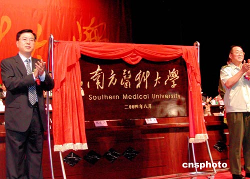 八月二十四日上午,第一军大学正式退出中国军队序列,整体移交给广东省,更名为“南方医科大学”。中央政治局委员、广东省委书记张德江(左)与中央军委委员、总后勤部部长廖锡龙上将(右)为“南方医科大学”揭牌。作者:王华