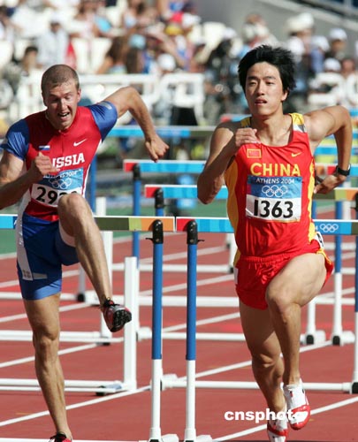 当地时间八月二十四日,中国著名田径选手刘翔(右)亮相雅典奥运赛场,在男子一百一十米跨栏预赛中,以十三秒二七的成绩名列小组第一进入第二轮预赛。中新社记者:毛建军