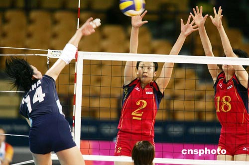 图为中国队员拦网如长城般难以突破。