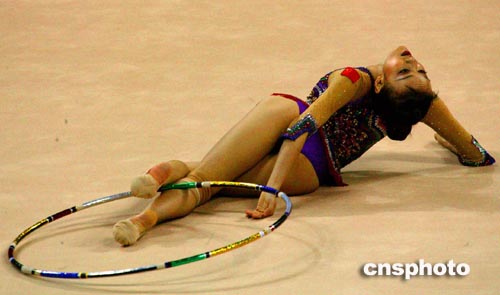 2002年釜山亚运会团体及个人全能冠军钟玲,当地时间24日参加艺术体操赛前排练,她将代表中国队出战雅典奥运会艺术体操个人全能比赛。中新社记者:王瑶