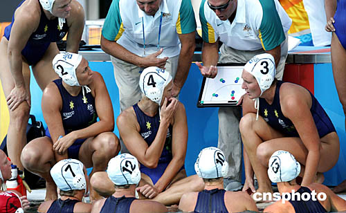 图为在女子手球比赛现场,教练在现场部署战术。最后希腊队战胜澳大利亚队挺进决赛。