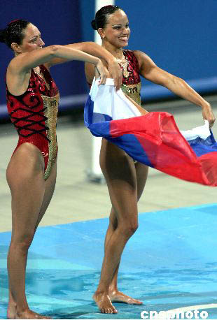 当地时间8月25日晚,在雅典奥运会花样游泳决赛中,俄罗斯选手以完美的表演和极具感染力的艺术气质毫无争议地获得冠军,登上奥运会最高领奖台。中新社记者:任晨鸣