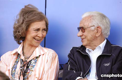 图为西班牙王后索非亚与萨马兰奇在赛场边亲切交谈的场面。