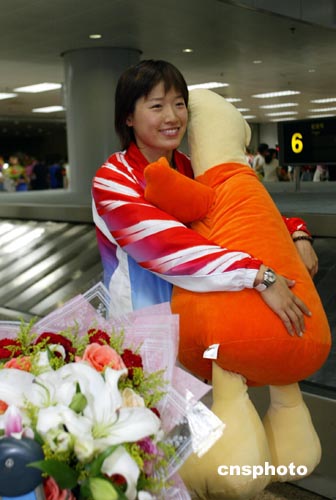 8月26日,北京首都国际机场又迎来一批载誉归来的奥运健儿,包括羽毛球、乒乓球、游泳、体操、举重等200多名选手,他们受到英雄般的欢迎。几乎每个人都被鲜花包围。图为在雅典奥运会游泳女子100米蛙泳决赛中夺得金牌的罗雪娟被鲜花簇拥着走出机场。中新社记者:盛佳鹏