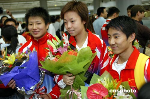 8月26日,北京首都国际机场又迎来一批载誉归来的奥运健儿,包括羽毛球、乒乓球、游泳、体操、举重等200多名选手,他们在机场受到英雄般的欢迎,几乎每个人都被鲜花包围。图为滕海滨(右)、张怡宁(中)、王旭(左)三位雅典奥运会金牌获得者在机场一起接受媒体采访。中新社记者:盛佳鹏