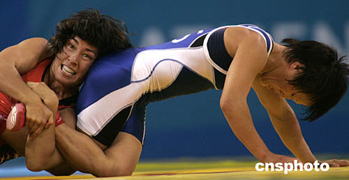 图为在美国选手Patricia Miranda和俄罗斯选手battles Lorisa Oorzhak在女子48公斤级摔交比赛中的镜头。