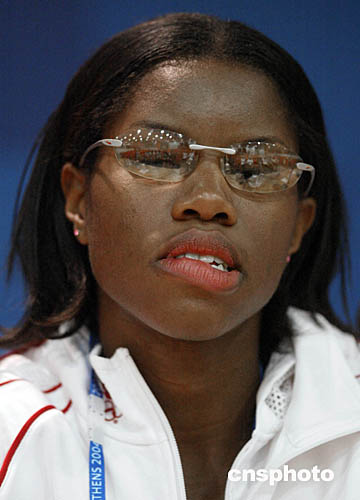 加拿大选手费利西安(Perdita Felicien)在雅典奥运会田径女子100米栏决赛中跨第二个栏时摔倒,没有完成赛程。图为她出席记者会时的镜头。