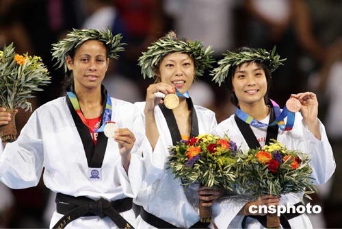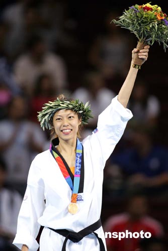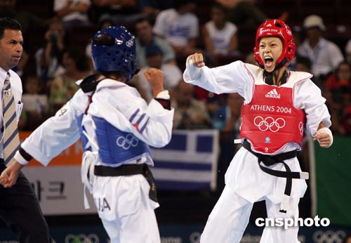 当地时间八月二十六日晚,在雅典奥运会女子四十八公斤级跆拳道决赛中,中国台北选手陈诗欣获得金牌。这是中国台北代表团在奥运历史上的首枚金牌。中新社记者:毛建军