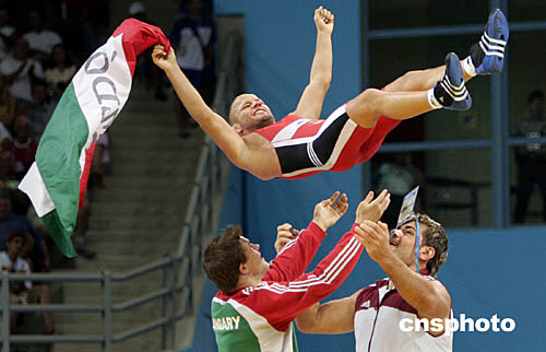 图为匈牙利选手毛约罗什(Istvan Majoros)在雅典奥运会摔跤男子55公斤级决赛中夺冠后庆祝的场面。