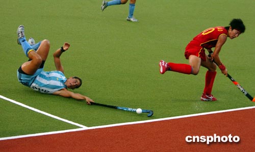 图为阿根廷球员倒地后仍奋力阻止中国队员的进攻。